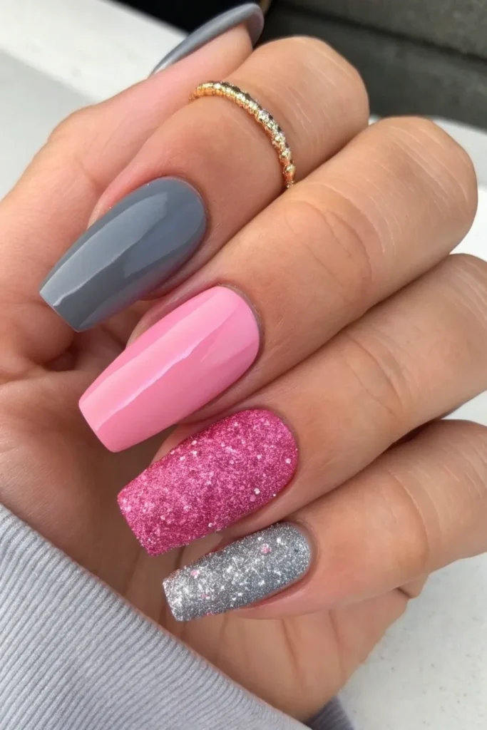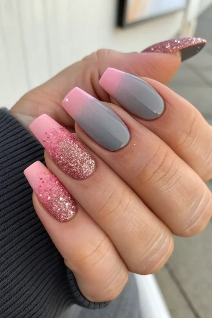 The combination of matte gray and pink glitter is more than just a passing trend. Gray offers calmness, balance, and sophistication, while pink glitter provides femininity, energy, and sparkle. Together, they strike a balance that works across all seasons and occasions. These designs can be styled up for parties and weddings or styled down for everyday wear, making them one of the most versatile choices in modern nail art.