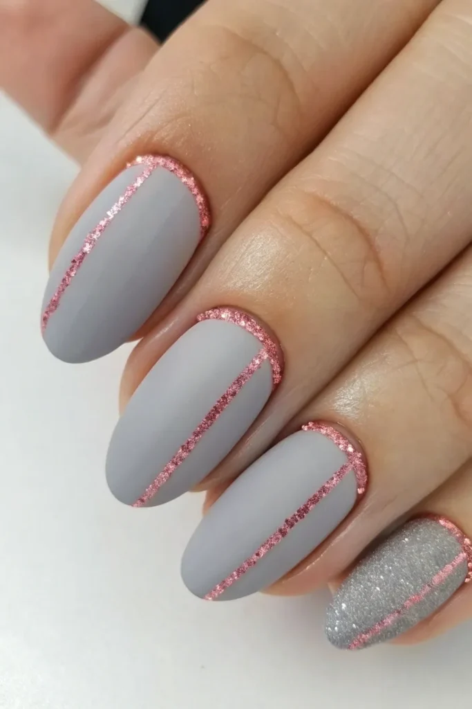 This subtle yet chic design involves painting the nails matte gray and adding a fine line of pink glitter along the cuticle. It is minimal but very stylish, making it a great choice for those who want a hint of sparkle without too much detail.