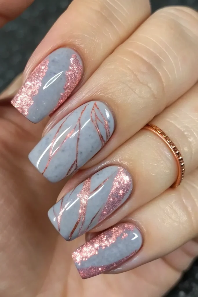 Create a marble-like effect by painting nails in matte gray and adding delicate streaks of pink glitter that resemble veins. This artistic design gives a luxurious and unique finish.