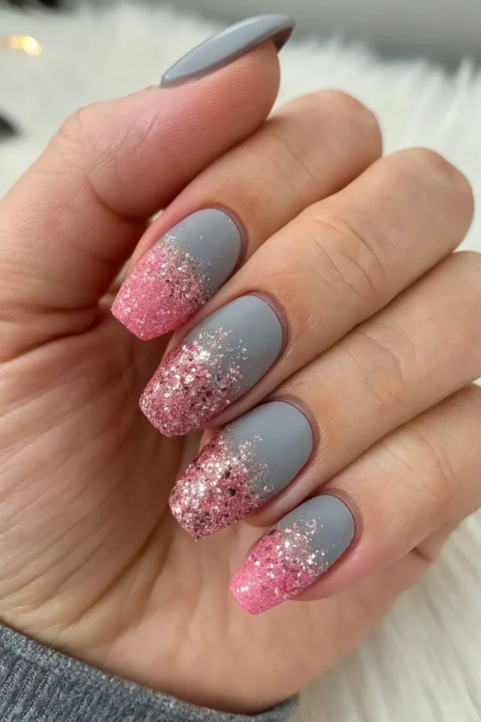 An ombre fade blends matte gray at the base into pink glitter at the tips, creating a seamless transition. The result is a soft yet glamorous gradient that is eye-catching but not too bold.