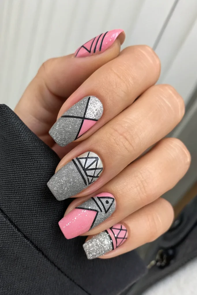 Experiment with modern art-inspired designs by using gray and pink glitter in geometric shapes such as triangles, lines, or squares. This makes the nails look edgy and stylish while highlighting your creativity.