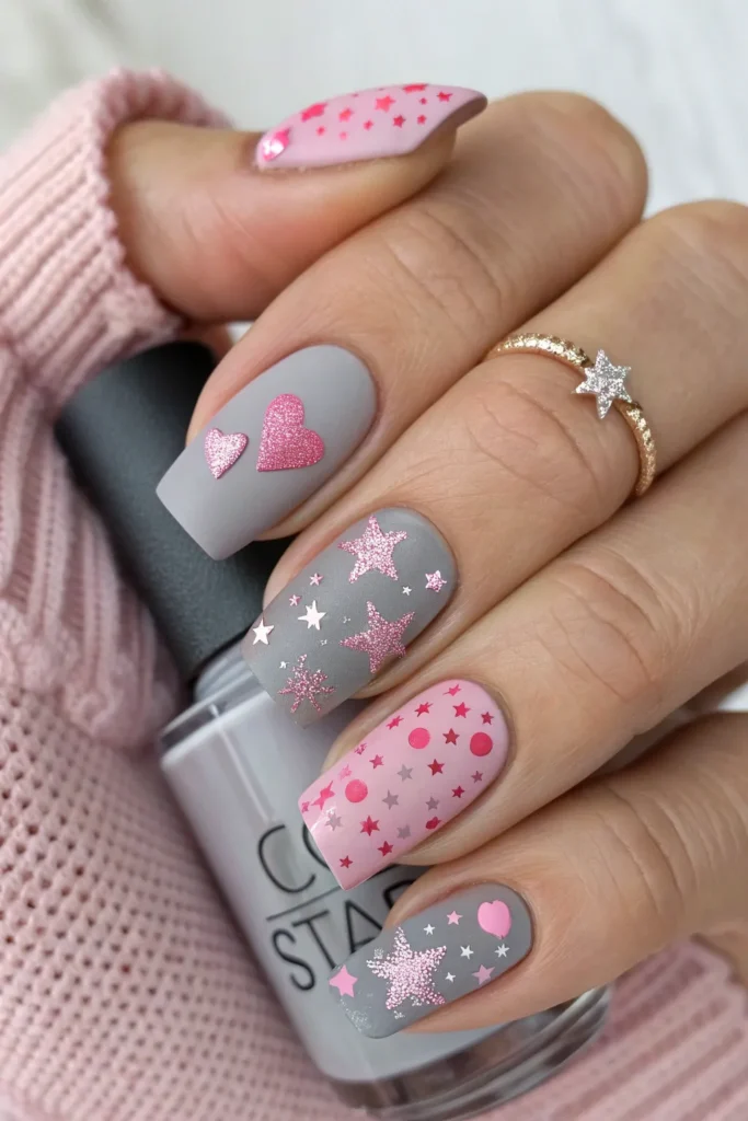 Adding pink glitter in the form of stars, hearts, or dots over a matte gray base gives the nails a playful and youthful feel. It is fun without losing elegance.