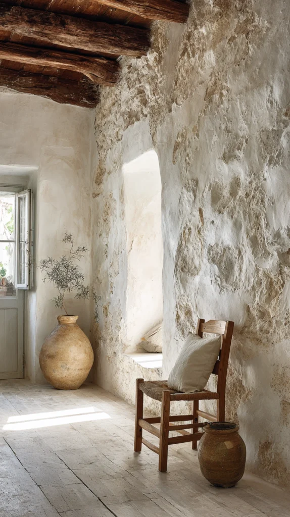 The particular white of a Mediterranean interior is not the bright, flat white of a freshly painted modern room. It is the softer, more complex white of limewash — slightly chalky in texture, uneven in depth of colour, and entirely different in quality from the uniform white that standard emulsion produces. Limewash absorbs and reflects light differently throughout the day, creating a wall that appears to shift in warmth and tone between morning and evening in a way that makes the room feel genuinely alive rather than statically decorated.