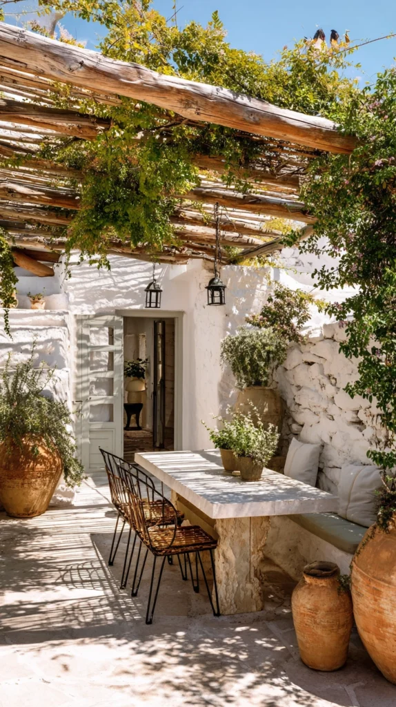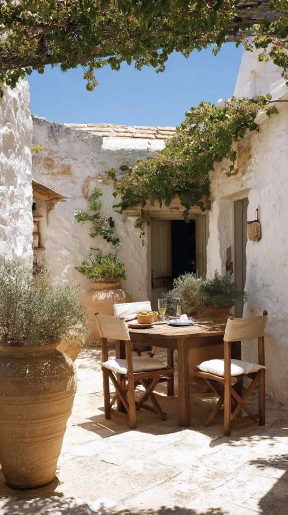 Style tip: Paint the interior walls of a small courtyard in warm white limewash rather than leaving them in their natural brick or render tone. A whitewashed courtyard wall reflects more light into the space, makes the area feel larger and more luminous, and creates the specific surface against which terracotta pots, climbing plants, and Mediterranean-palette furnishings look most completely right.