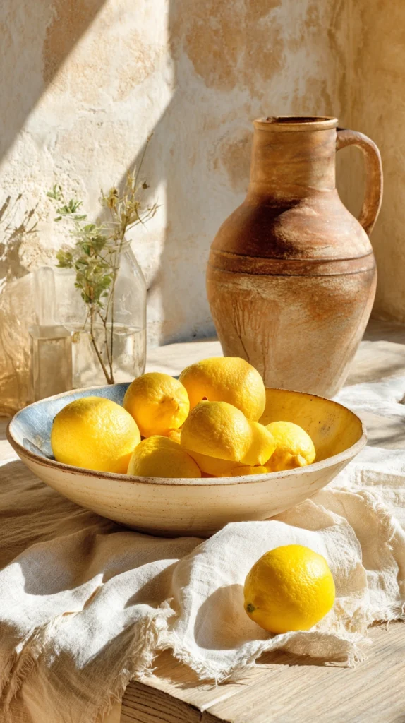 A kilogram of unwaxed lemons costs $2–$5 from a grocery or market. A wide, shallow ceramic fruit bowl costs $15–$30. A small citrus tree — lemon, lime, or kumquat — grown in a large container on a sunny terrace costs $25–$60 as a young plant and produces fruit in its second or third year. A container-grown citrus tree that produces fruit for cutting and display throughout the summer is the most Mediterranean of all possible kitchen garden plants and one of the most rewarding for a home that wants to bring this aesthetic into daily life rather than simply reference it decoratively.