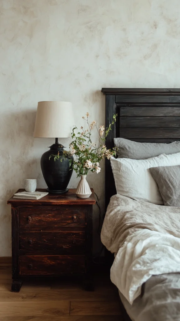 Dark wood dining tables in solid walnut, oak, or mango wood cost $200–$600 for a table seating six. Vintage and second-hand dark wood furniture from markets and estate sales costs $50–$200 for pieces of equivalent quality to new furniture at two or three times the price. A dark wood bed frame runs $200–$500 new. The furniture does not need to be new or expensive — patina and age suit the Mediterranean aesthetic considerably better than factory-fresh uniformity, and a well-made piece that has been used for twenty years looks more appropriate against a limewashed wall than an identical piece that came out of a box last week.