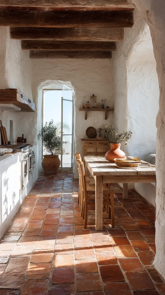 Terracotta floor tiles are the single most transformative flooring choice for a Mediterranean interior. The warm, earthy orange-red tone grounds every other element in the room — white walls, linen textiles, dark wood furniture, and clay pots all look precisely right against terracotta in a way they rarely achieve against the cool tones of grey stone or pale wood flooring. In summer, unsealed or lightly sealed terracotta stays naturally cool underfoot, which adds a sensory quality to the aesthetic appeal that no other floor material in this colour range provides.