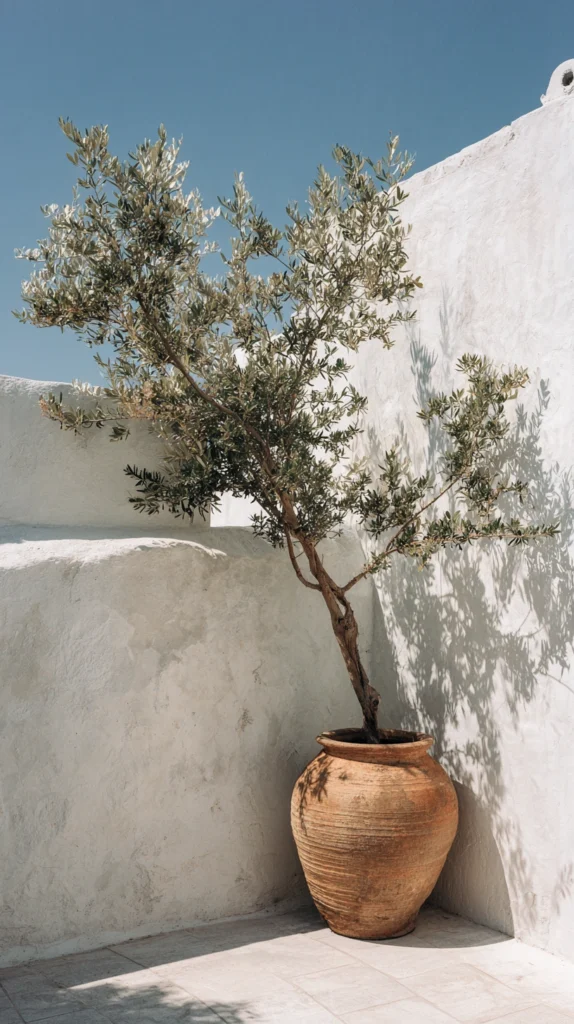 Style tip: Resist underplanting the olive tree pot with other plants. The olive in a simple clay pot against a white wall is a complete composition that needs nothing added to it. Underplanting introduces a busyness that works against the clean, spare quality of the Mediterranean aesthetic — and the olive itself, given full access to the pot’s soil volume, grows more vigorously and looks better for it.