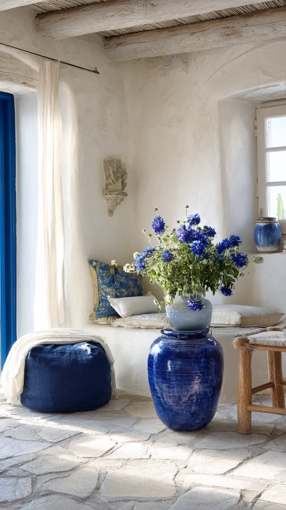 The blue of a Mediterranean interior is not the bright, saturated blue of a nursery or the pale blue of a coastal cottage. It is deeper and more complex — the blue of deep water, of a Greek church dome, of hand-painted ceramic tiles seen from a distance. Used as an accent against white walls, natural stone, and warm wood tones, this deep blue creates the specific visual tension that makes Mediterranean interiors feel simultaneously calm and visually rich. It does not need to appear everywhere in the room — a few considered placements are enough to establish the palette.