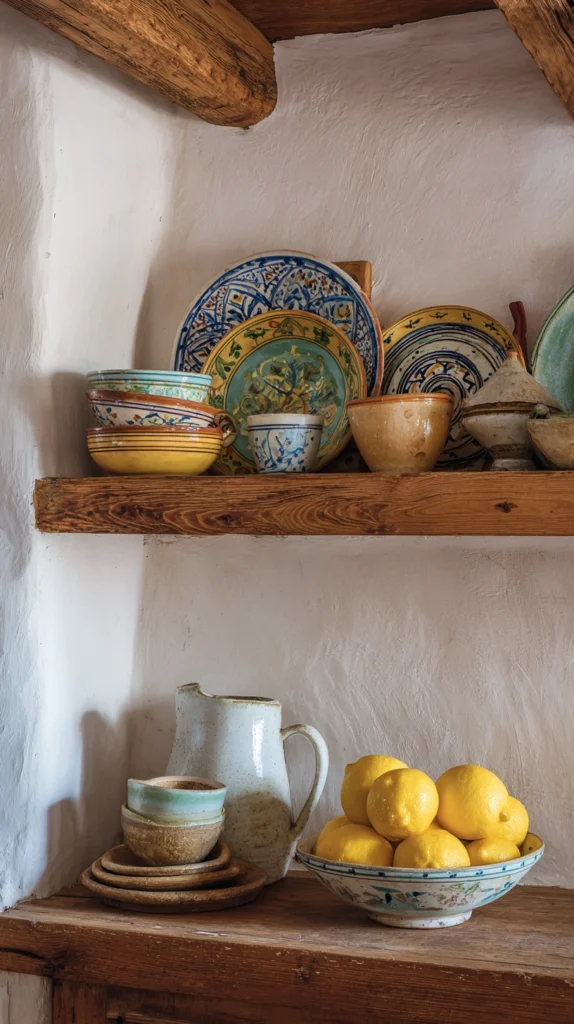 Hand-painted Mediterranean-style ceramic dishes from independent makers on Etsy cost $15–$50 each. A set of four hand-thrown stoneware bowls runs $40–$120 from a studio potter. Hand-painted tile trivets cost $10–$30 each. A large hand-thrown ceramic jug suitable for flowers or water costs $30–$80. Prioritise quality over quantity — three genuinely well-made ceramic pieces displayed on a shelf or used at the dinner table create a stronger impression of Mediterranean abundance than ten mass-produced pieces arranged in the same space. The making is visible in the best ceramics and it is that quality of visible craft that the aesthetic depends on.