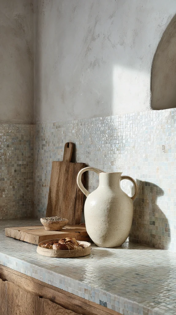Zellige tiles — the small, handmade, slightly irregular Moroccan mosaic tiles in rich jewel tones — and hammam-style patterned encaustic tiles are among the most immediately luxurious-feeling surfaces available for a Mediterranean-influenced interior. Used as a splashback in a kitchen, a feature panel in a bathroom, or a tiled surface on an outdoor table, they bring a level of colour, craft, and visual complexity that transforms the character of the surface and the room around it in a way that no other material quite achieves at equivalent cost.
