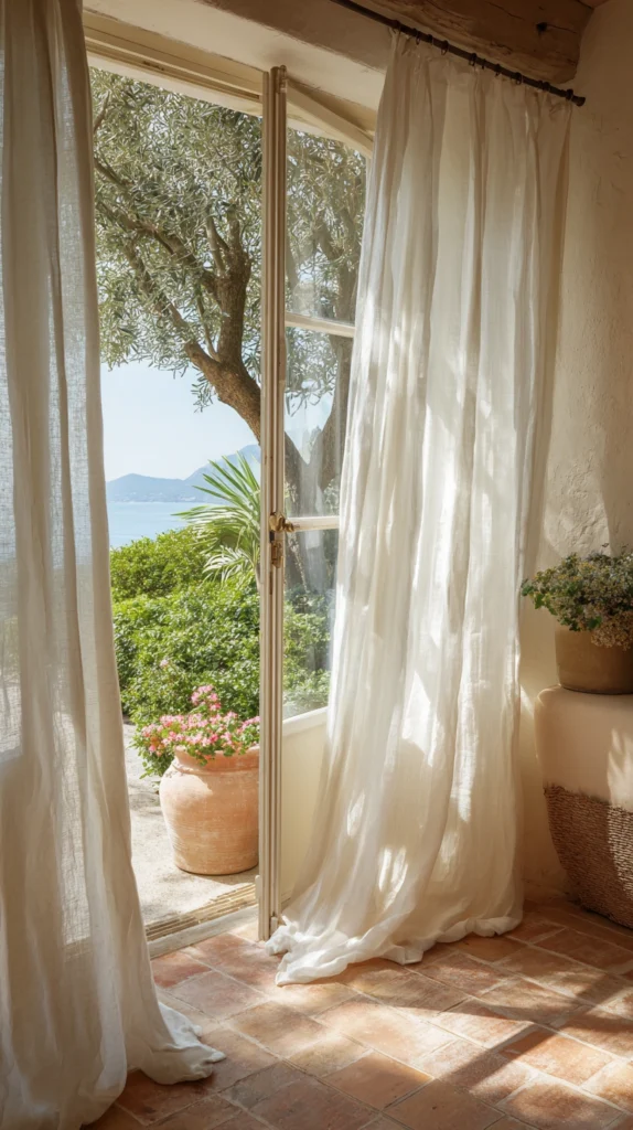 Style tip: Allow linen curtains to puddle 5–10 cm on the floor rather than hanging them to an exact floor-grazing length. The pooled fabric at the base creates the generously proportioned, slightly undone quality of Mediterranean curtaining — the suggestion of abundance and ease rather than the precision of a tailored window treatment. It is a detail that takes ten seconds to arrange and defines the character of the whole window.