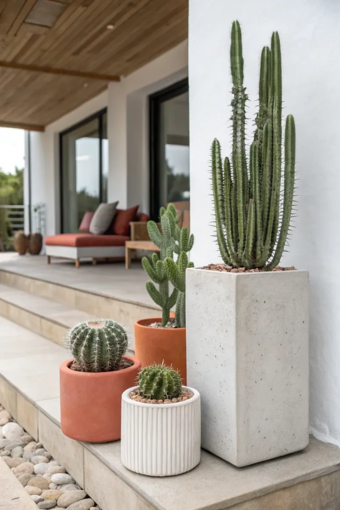 Update the classic cactus element with sleek planters and sculptural arrangements.