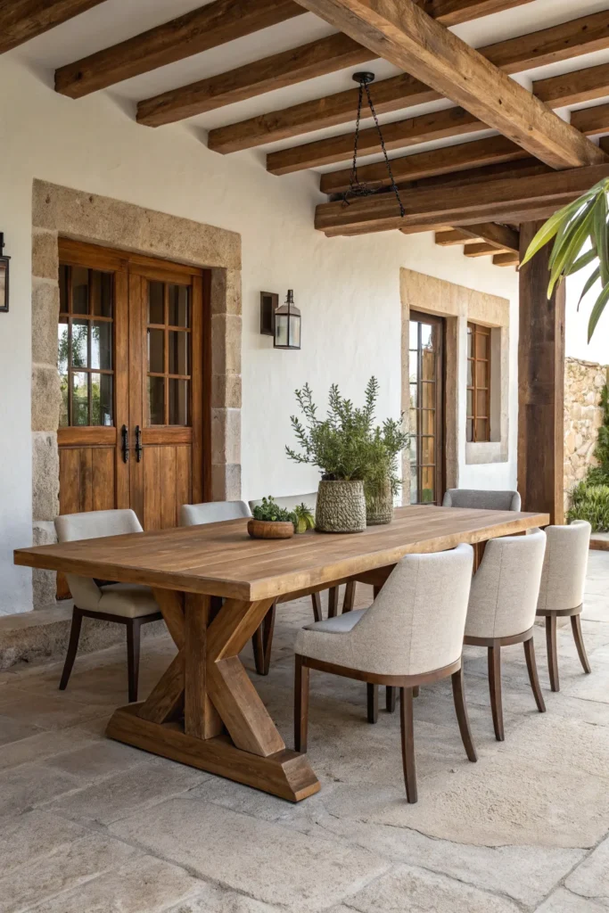 Blend rustic textures with modern silhouettes by choosing simplified furniture crafted from natural woods.