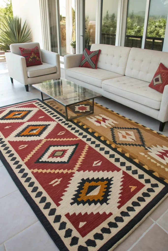 - Flatwoven rugs with geometric Zapotec-inspired patterns
