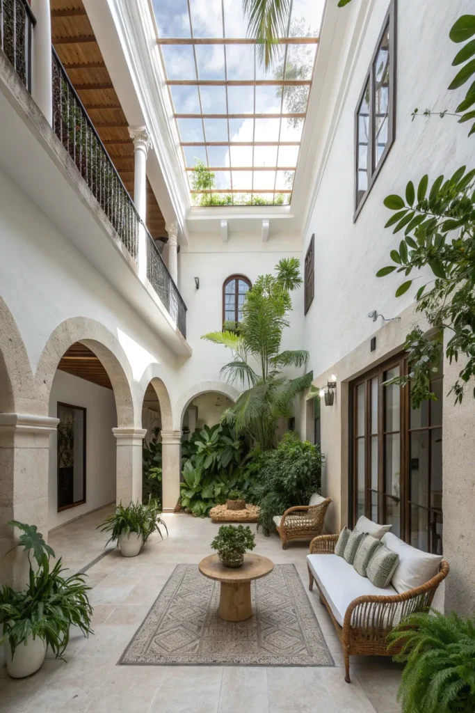 Reimagine the traditional Mexican courtyard with clean lines, natural light, and minimalist greenery.