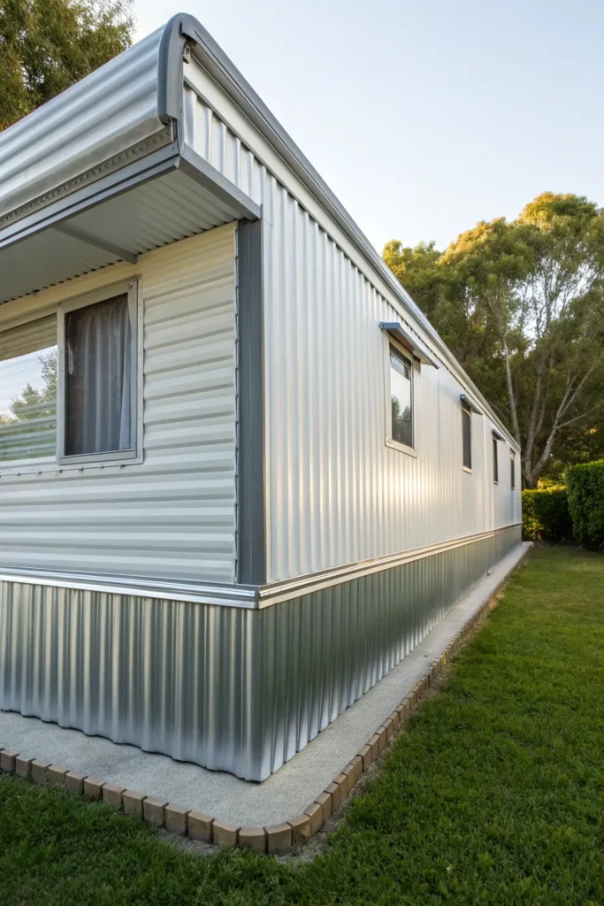 Corrugated steel skirting adds bold industrial flair. It’s highly durable, weather-resistant, and unique—great for modern and edgy homeowners.