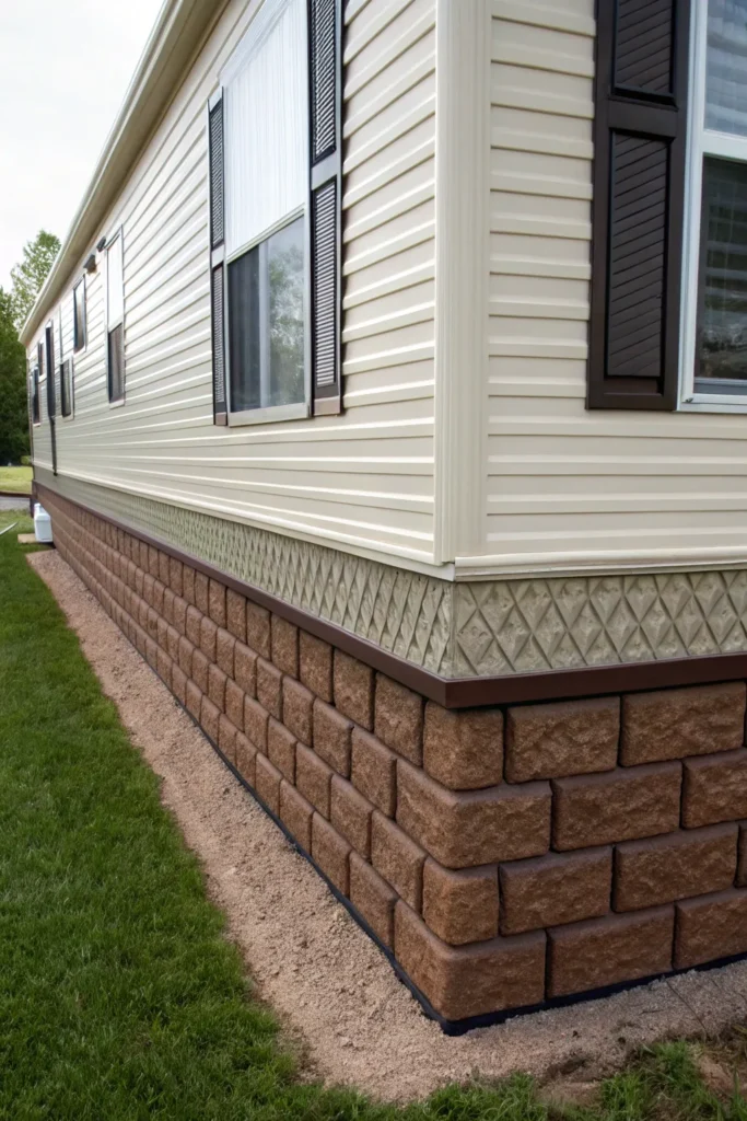 Brick-pattern skirting panels add timeless charm and durability. They create the illusion of a permanent structure while remaining lightweight and easy to install.