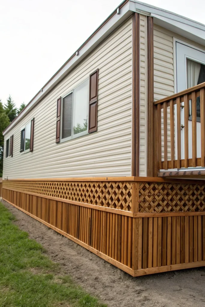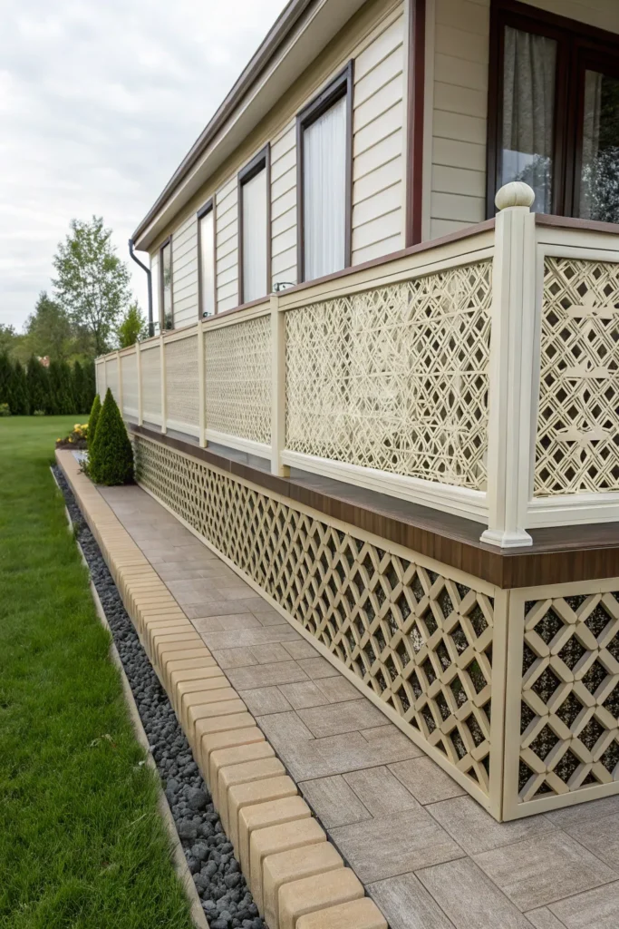Lattice skirting offers classic cottage charm and allows airflow beneath the home—perfect for humid climates. White lattice feels crisp and traditional, while black creates a bold contrast.
