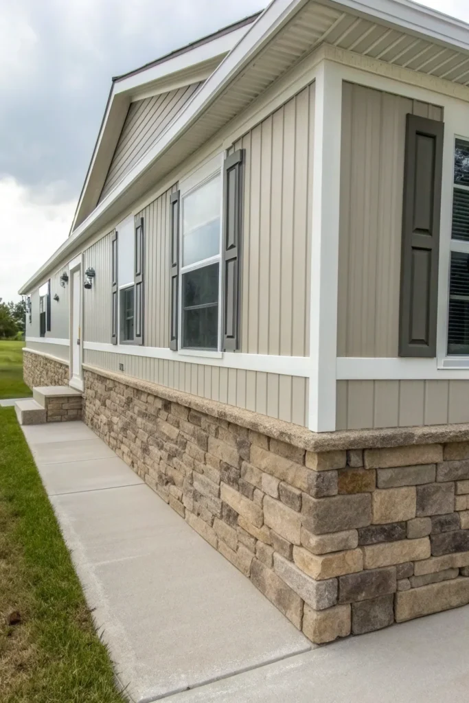 Want a luxury look without the price tag? Faux stone skirting mimics real stone but at a much lower cost and lighter weight. It immediately adds richness and depth, giving your mobile home a solid, grounded feel.