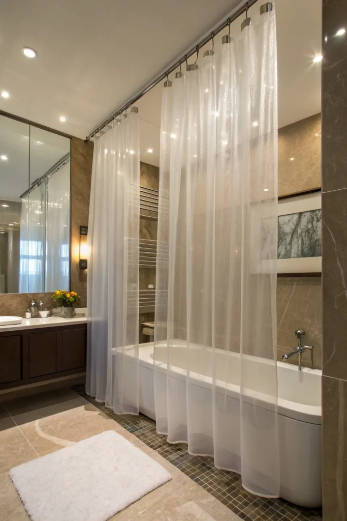 A minimalist favorite—transparent curtains keep your bathroom feeling open and clean.