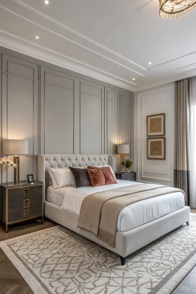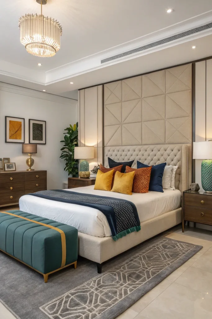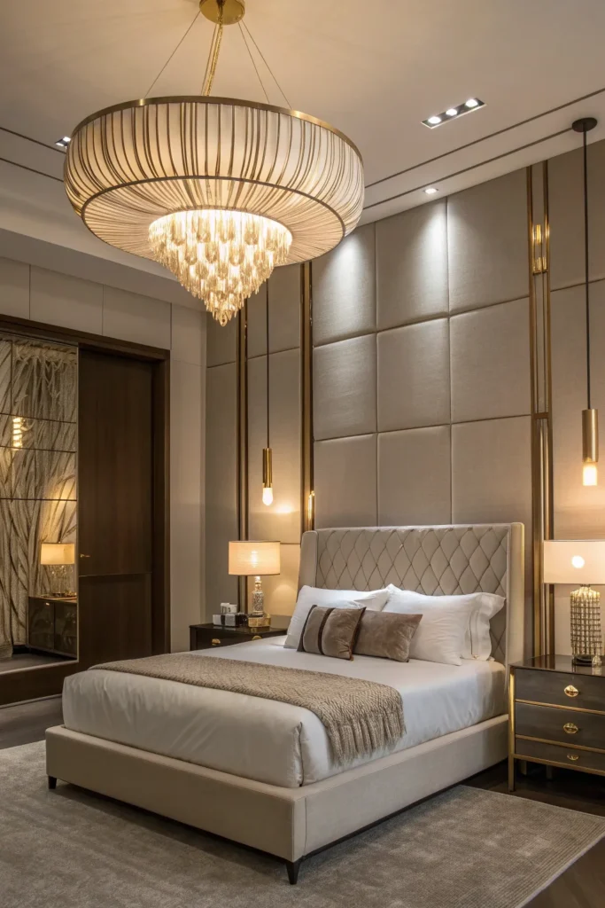 Lighting is one of the most defining elements in modern décor. Choose a standout fixture—a sculptural pendant, geometric chandelier, or minimalist LED design—to elevate the room instantly. Complement it with modern bedside lamps or wall-mounted sconces to create layers of soft, warm lighting that feels cozy yet sophisticated.