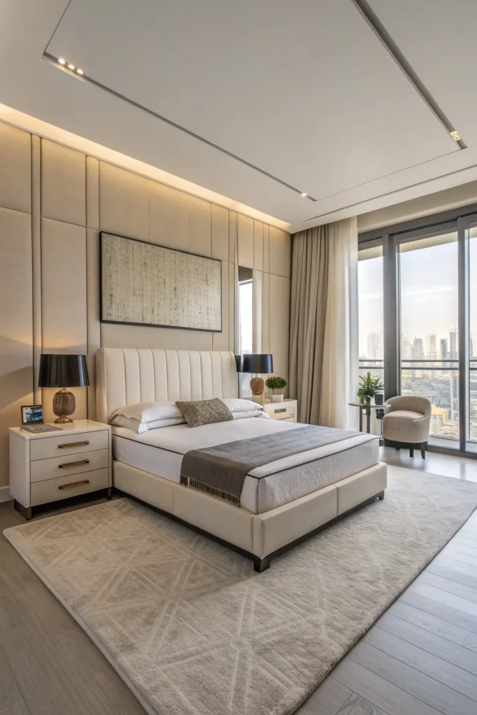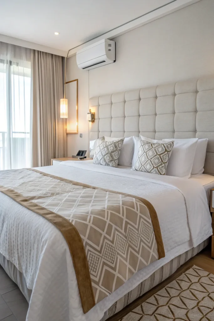 Bedding plays a major role in setting the tone of your modern bedroom. Choose solid colors, subtle patterns, or geometric designs. Crisp white sheets paired with a soft neutral duvet create a refined and hotel-like feel. Layer with structured pillows and a simple throw to achieve that polished, modern finish.