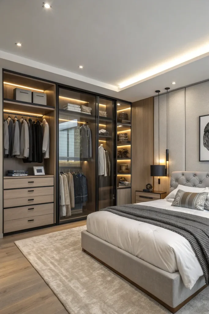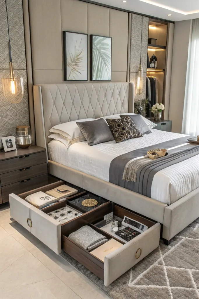 Modern bedrooms often prioritize function just as much as style. Incorporate built-in wardrobes, floating shelves, or sleek dressers that maximize storage without adding visual weight. Floating nightstands or wall-mounted units give the illusion of more space and maintain a clean floor area.