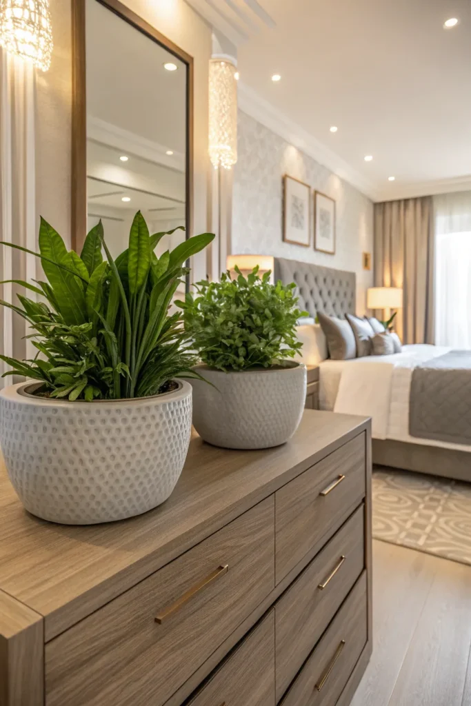Plants add life, freshness, and natural softness to modern bedroom decor. Choose simple, sculptural plants like snake plants, peace lilies, or fiddle-leaf figs. Use modern planters in matte black, concrete, or ceramic finishes. Just a few thoughtfully placed plants can transform the entire mood of your bedroom.