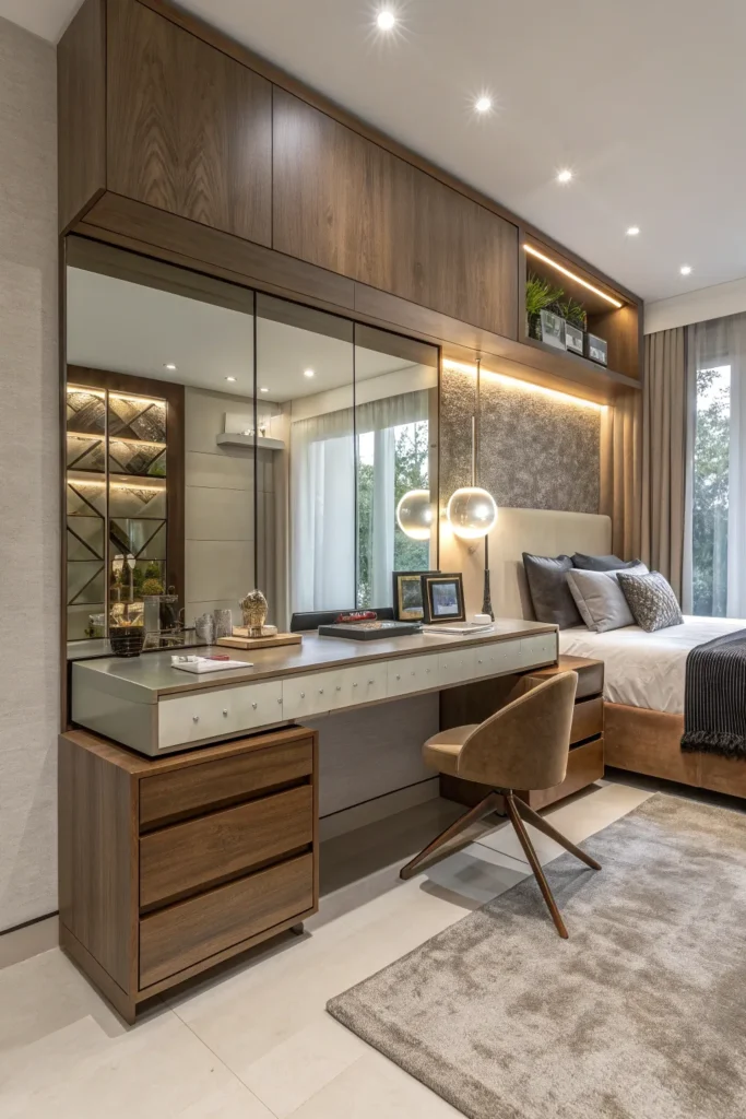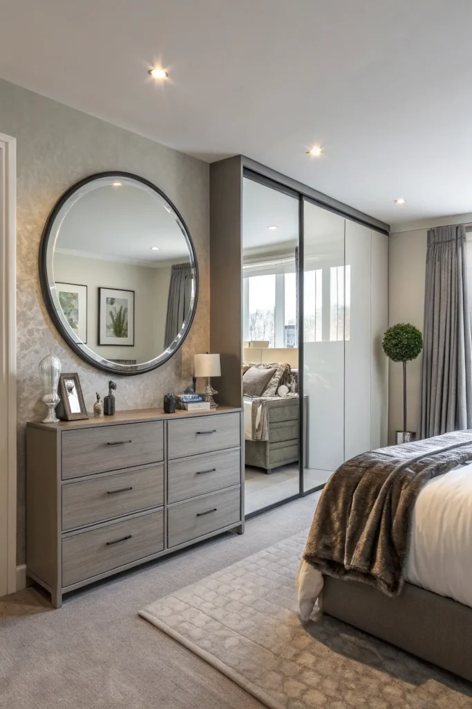 Mirrors are powerful tools in modern bedroom design. They reflect natural light, enlarge the perception of space, and add a sleek, reflective element. Hang a large round mirror above a dresser, use mirrored closet doors, or place a tall floor mirror in a corner to make the room feel more open.