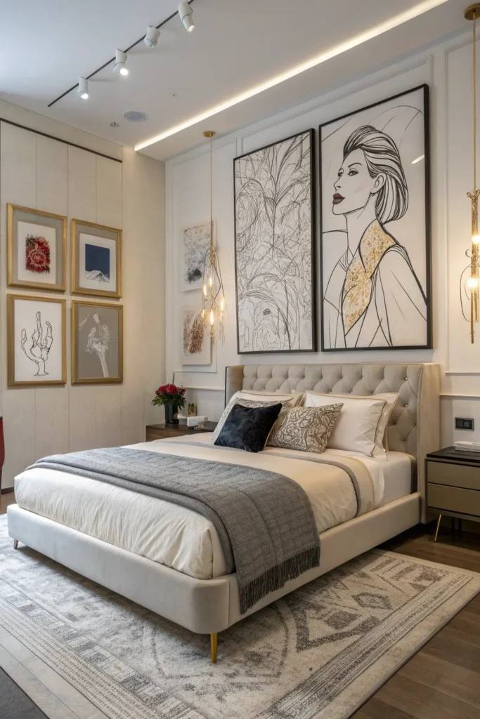 Modern décor embraces art that adds personality without overwhelming the space. Large-scale abstract pieces, linear illustrations, or black-and-white photography work beautifully. Hang one oversized piece above the bed or create a minimalist gallery wall. Keep frames simple to maintain a cohesive look.