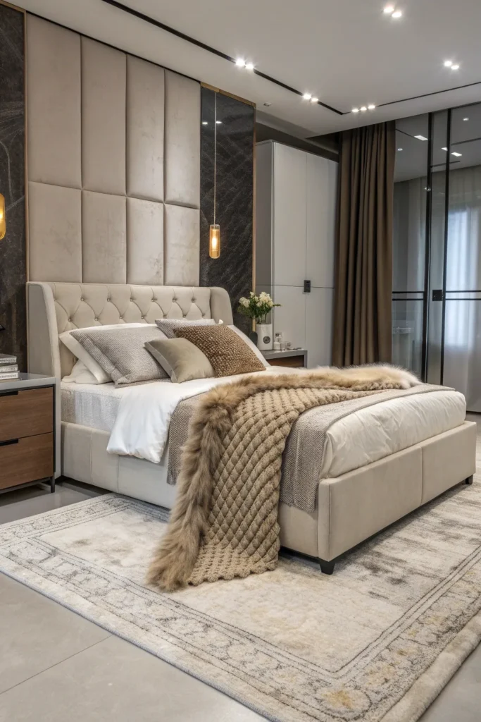 Even the sleekest modern bedroom should feel inviting. Layer soft textiles like cotton bedding, faux fur throws, or knitted blankets. Choose area rugs with subtle patterns or plush textures to add depth underfoot. These elements create balance by softening the sharp lines and hard surfaces common in modern design.