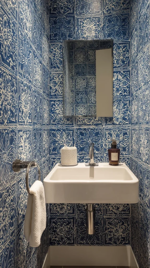 The comprehensive coverage demonstrates design confidence while the bold patterns ensure powder rooms become conversation-worthy spaces guests remember long after visits conclude. Select patterns in colors coordinating with home’s overall palette maintaining some design continuity despite the dramatic departure powder rooms represent.