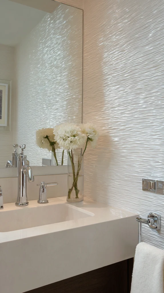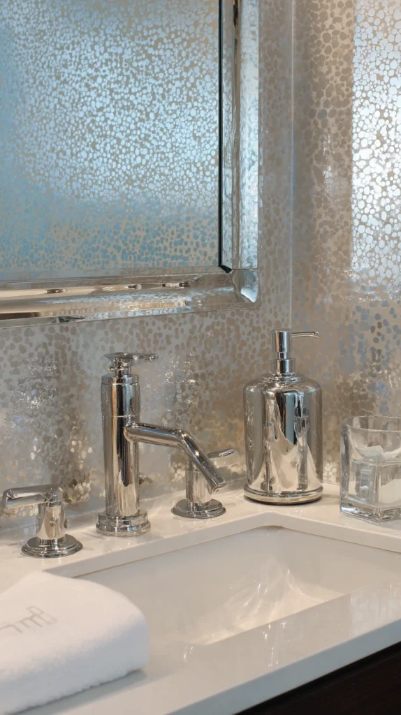 The reflective qualities enhance natural and artificial light making small spaces feel brighter and more spacious while the metallic glamour adds the kind of luxury typically reserved for larger more prominent rooms. Pair with coordinating metallic fixtures and hardware reinforcing the glamorous aesthetic while maintaining design cohesion.