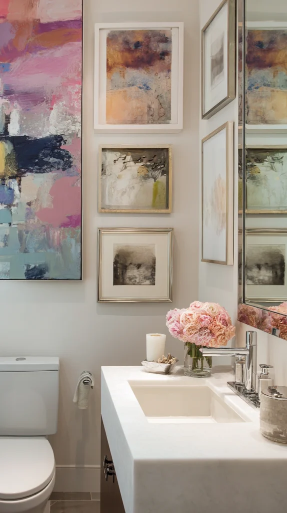 Transform powder rooms into miniature galleries featuring curated artwork collections creating cultural sophistication and demonstrating that even the smallest rooms deserve artistic consideration. Hang multiple pieces in salon-style arrangements creating dynamic compositions, feature single substantial artworks making bold statements, or rotate displays seasonally maintaining fresh current presentations.