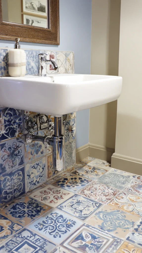 Ground powder rooms through distinctive floor tile patterns creating visual interest and establishing design foundations that support more restrained wall treatments maintaining balance. Install encaustic cement tiles in traditional or contemporary patterns, use mosaic tile creating intricate designs, or embrace geometric porcelain tile in bold patterns.