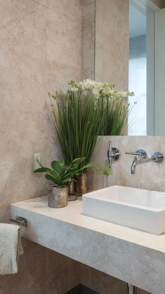 Incorporate vertical gardens or abundant plant displays creating living walls that bring nature indoors while adding organic beauty and improving air quality through natural purification. Install modular living wall systems filled with appropriate plant varieties tolerating bathroom humidity and available light, hang multiple plants at varied heights creating green walls, or position substantial floor plants making botanical statements.