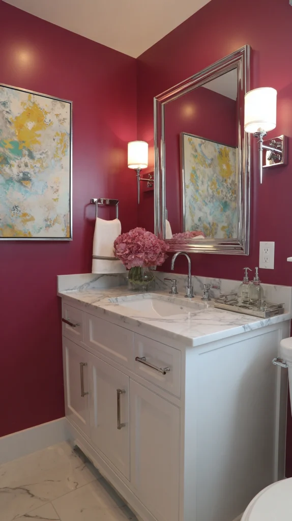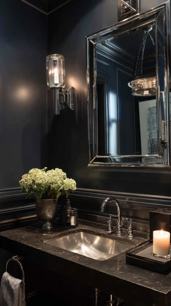 The dark palette creates sophisticated unexpected environments while the bold color choice demonstrates design confidence. Include generous mirrors reflecting light and expanding perceived space while the reflective surfaces prevent dark colors from overwhelming despite their intensity.