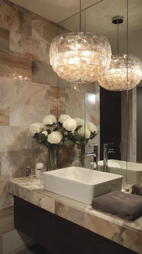 The substantial lighting creates the kind of unexpected luxury that elevates powder rooms beyond purely functional spaces while the dramatic fixtures demonstrate that even the smallest rooms deserve design investment and attention. Select finishes coordinating with plumbing fixtures maintaining cohesive metallic palettes throughout.