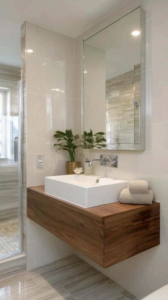 Choose vanities with clean simple lines and minimal hardware maintaining modern aesthetics, select materials including natural wood, lacquered finishes, or stone creating desired character, and ensure adequate depth providing functional counter space without protruding excessively into limited floor area.