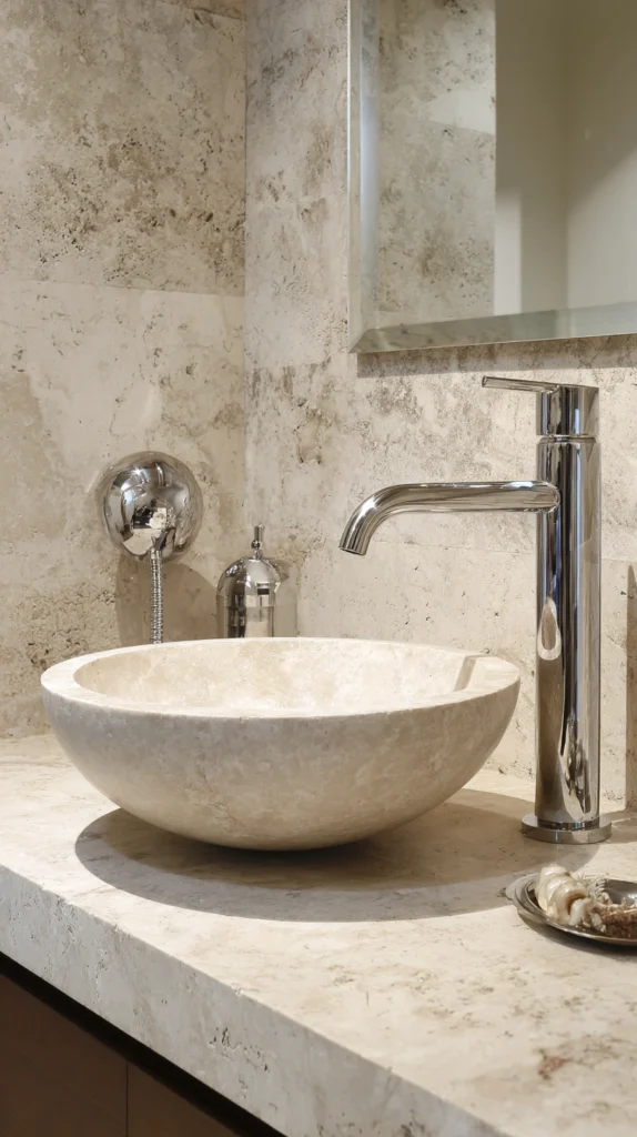 Choose vessel sinks in materials beyond standard porcelain including glass, stone, concrete, or metal creating textural interest, select basins in unusual shapes or colors making bold statements, and pair with coordinating statement faucets in finishes and designs complementing sink selections.