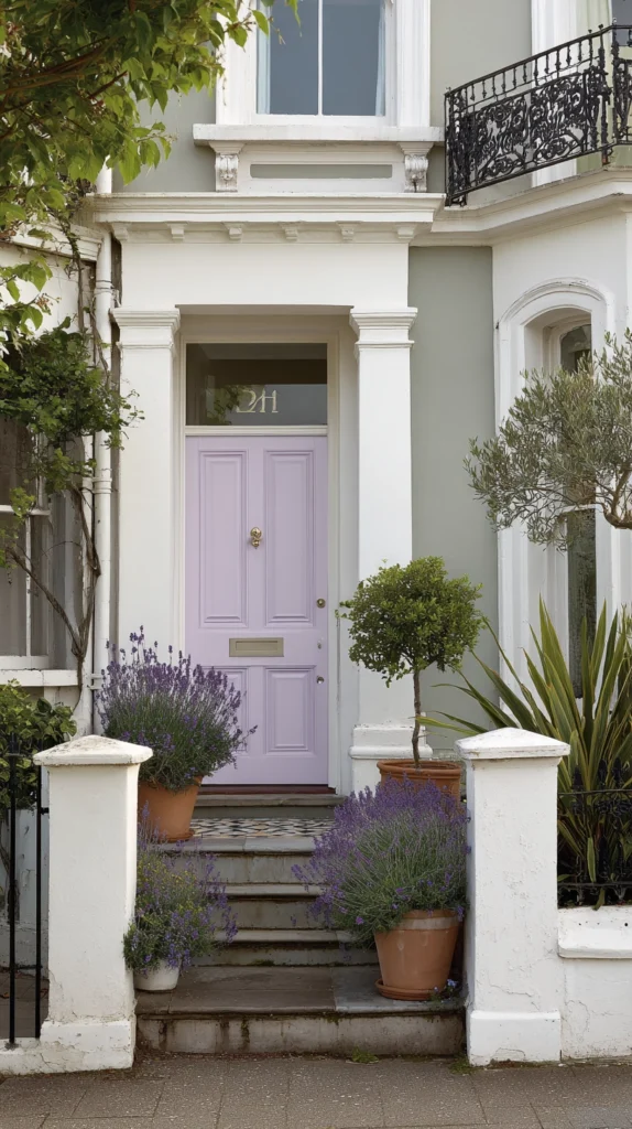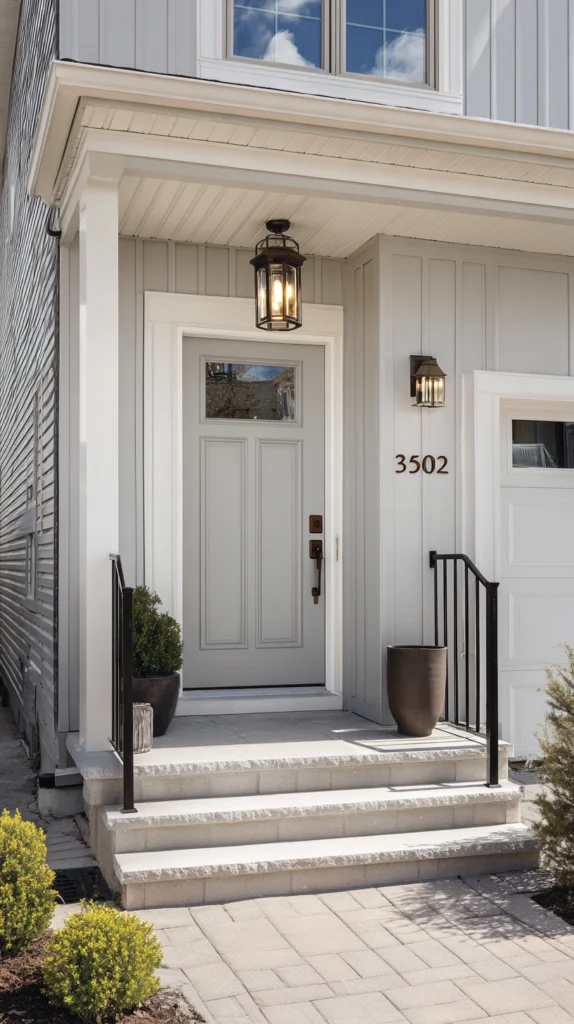 Pale silver grey with dark bronze door hardware, light fixtures, and house numbers creates a scheme of exceptional subtlety and refinement. On a pale silver facade, bronze sits like jewelry. visible, beautiful, and entirely complementary. Ensure all bronze hardware is consistent in finish throughout. door handles, knocker, letterbox, and light fixtures all matching for a unified result.