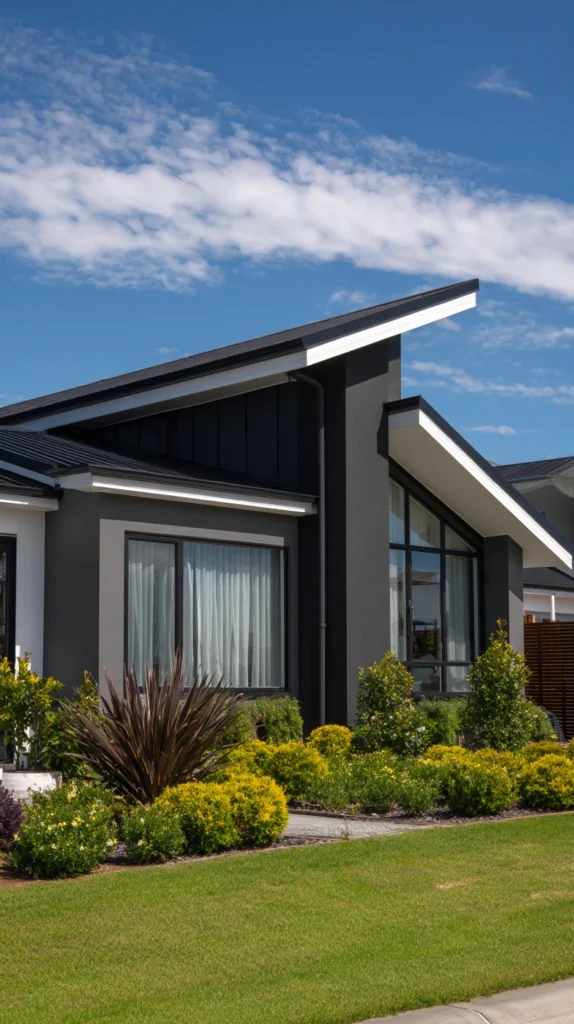 Grey walls with a dark grey or black roof and white painted fascias create a clear vertical hierarchy. The dark roof anchors the top, the white fascias define the boundary between wall and roof, and the grey provides the calm unified field between. Choose a matte roofing material in concrete tile, natural slate, or matte metal for the depth that coordinates with grey walls most naturally.