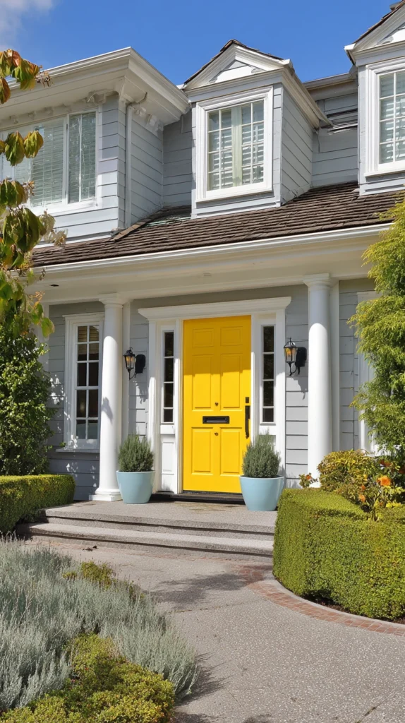 Light grey with a single bold yellow front door is one of the most welcoming and joyful exterior schemes available. Yellow and grey appear together constantly in the natural landscape. pale sunlight against grey clouds, buttercups against grey stone. Choose a warm golden or mustard yellow rather than a cool lemon tone and keep all other trim in white with matte black or brushed brass hardware throughout.