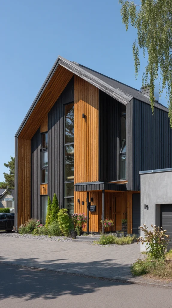 Dark grey with sections of vertical cedar or larch cladding creates a strong Scandinavian and contemporary architectural influence. The vertical timber lines add height and graphic rhythm while the warm wood tone contrasts beautifully against the cool dark grey. This scheme suits modern architectural forms most powerfully. clean lines, large windows, and minimal ornament where materials do the design work.