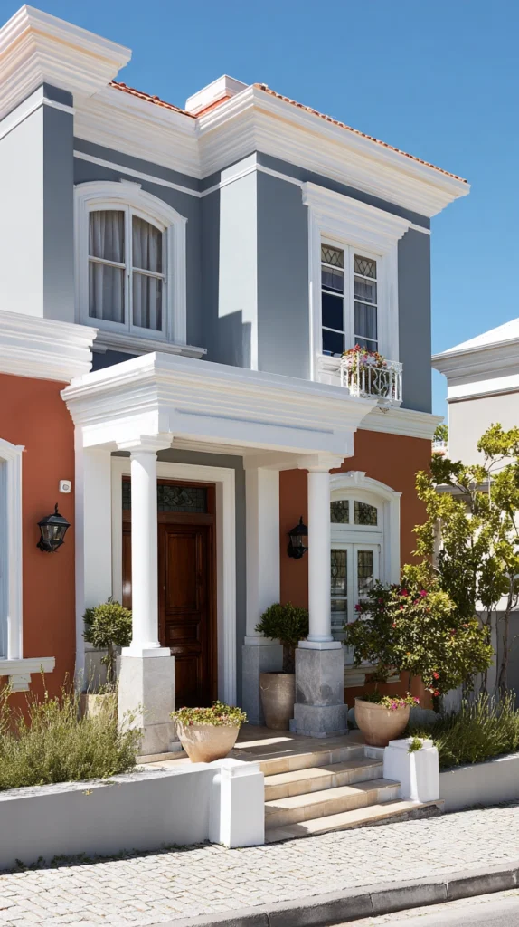 A grey exterior with a terracotta render band at plinth level and white trim above creates Mediterranean warmth and material variation that a single-color grey facade cannot provide. The terracotta band grounds the grey walls and makes the house feel anchored and stable. Choose a dusty, warm clay tone rather than a bright orange-red that would overwhelm the restraint of the grey above it.