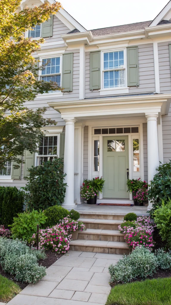 Light grey paired with sage green on the front door and shutters creates one of the most naturally beautiful modern exterior schemes currently popular. Sage green references the garden and the landscape in a way no other accent color on grey quite achieves. Keep window trim in white for clarity and add white or cream fascias to complete the three-color scheme.