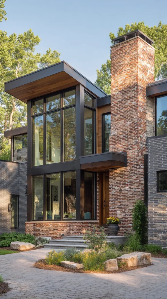 Mid-toned grey combined with warm brick detailing. a brick chimney, brick window surrounds, or a brick base course. creates an exterior of considerable material richness. The warm red-orange of traditional brick provides a complementary counterpoint to the cool grey walls. Choose a grey with a faint warm undertone to bridge the gap between the two materials harmoniously.
