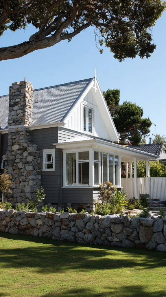 A grey exterior incorporating sections of white weatherboard on a gable end and natural stone on a chimney or boundary wall creates a facade of genuine material complexity. The grey acts as the unifying field color that holds the white and stone together without competing with either. Choose a neutral mid-grey with no dominant undertone to relate equally well to both the warm stone and the cool white.