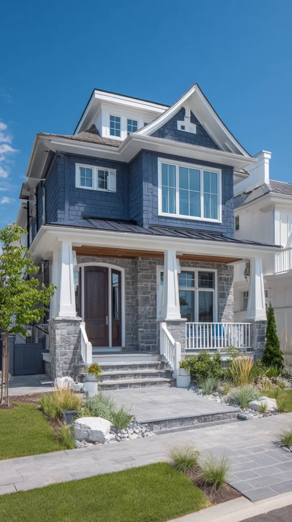 Slate grey walls with navy blue on the front door and window frames reference the traditional coastal architecture of New England and Northern Europe in a thoroughly contemporary way. The slate and navy combination draws from the same palette as weathered timber and deep water. Choose a navy with a slightly grey undertone to relate harmoniously to the body color and pair with white trim throughout.